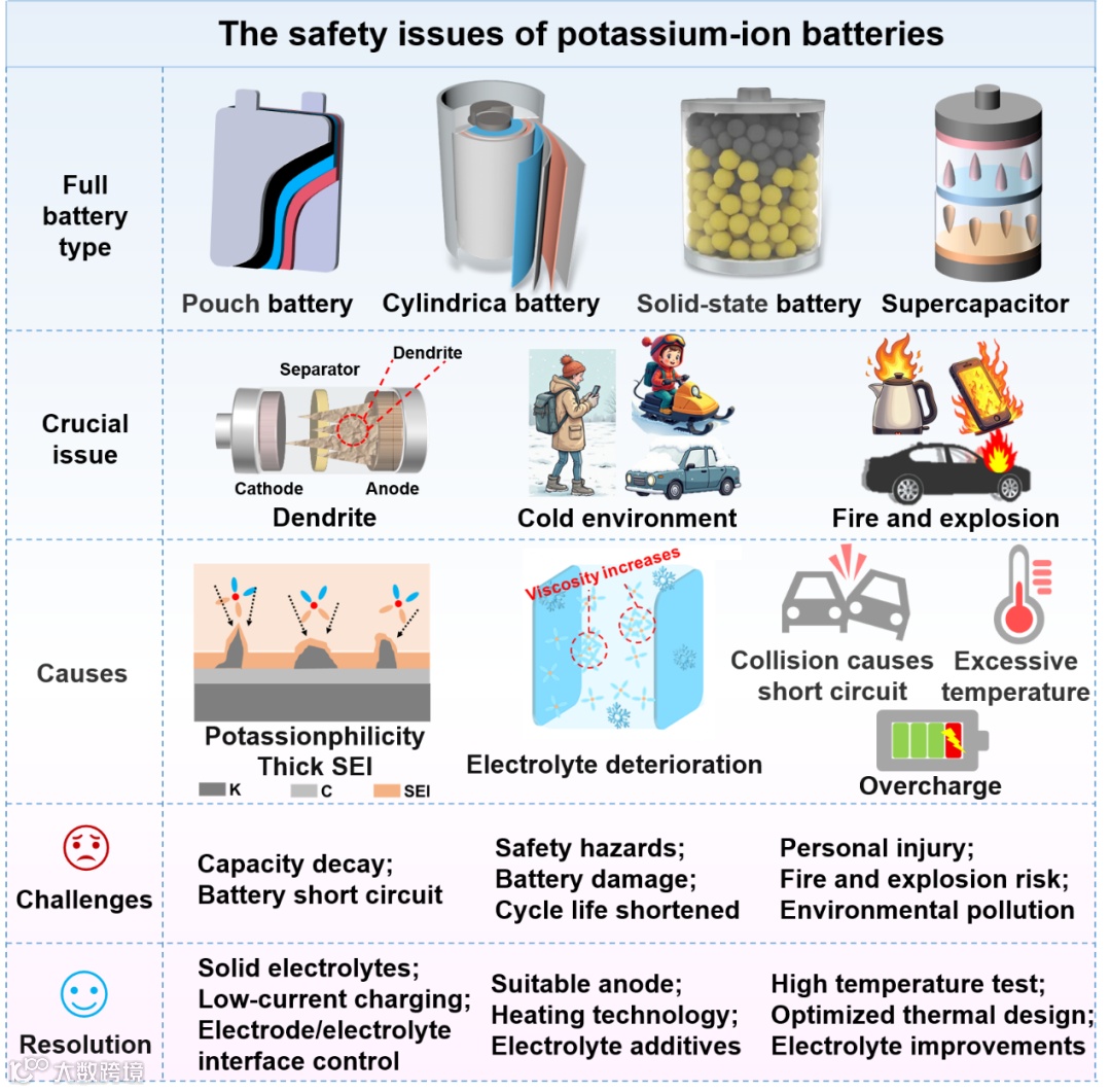 PIBs在商业化过程中主要面临安全性挑战,包括钾枝晶形成、潜在短路以及低温环境下电解液性能下降等(图7)。枝晶的产生源于钾离子迁移受限和沉积不均,使电极表面形成尖锐突起,可能刺穿隔膜,引发短路甚至燃烧。针对这一问题,研究者提出了多种解决策略:通过电极表面修饰或纳米结构设计形成保护层,可有效抑制枝晶生长;选择或优化电解液,尤其是固态电解质,可提高界面稳定性并降低枝晶风险。对于石墨负极,可通过预嵌钾形成稳定SEI膜、构建复合结构来缓解体积膨胀和材料脱落问题,从而提升能量密度与循环安全性。层状金属氧化物正极易吸湿并与电解液反应,导致结构劣化和离子通道阻塞,可通过表面涂层或界面稳定化策略形成致密保护层,阻隔水分和过渡金属与电解液接触,抑制晶格氧逸出,降低安全风险。针对有机电解液的可燃性和低温性能问题,可开发低黏度、高导电性配方,并配合低温适应性电极设计,以保障PIBs在各类工况下的安全稳定运行。总体来看,通过电极表面工程、电解液优化及结构设计等综合措施,PIBs的安全性瓶颈正逐步被突破,为其商业化奠定基础。