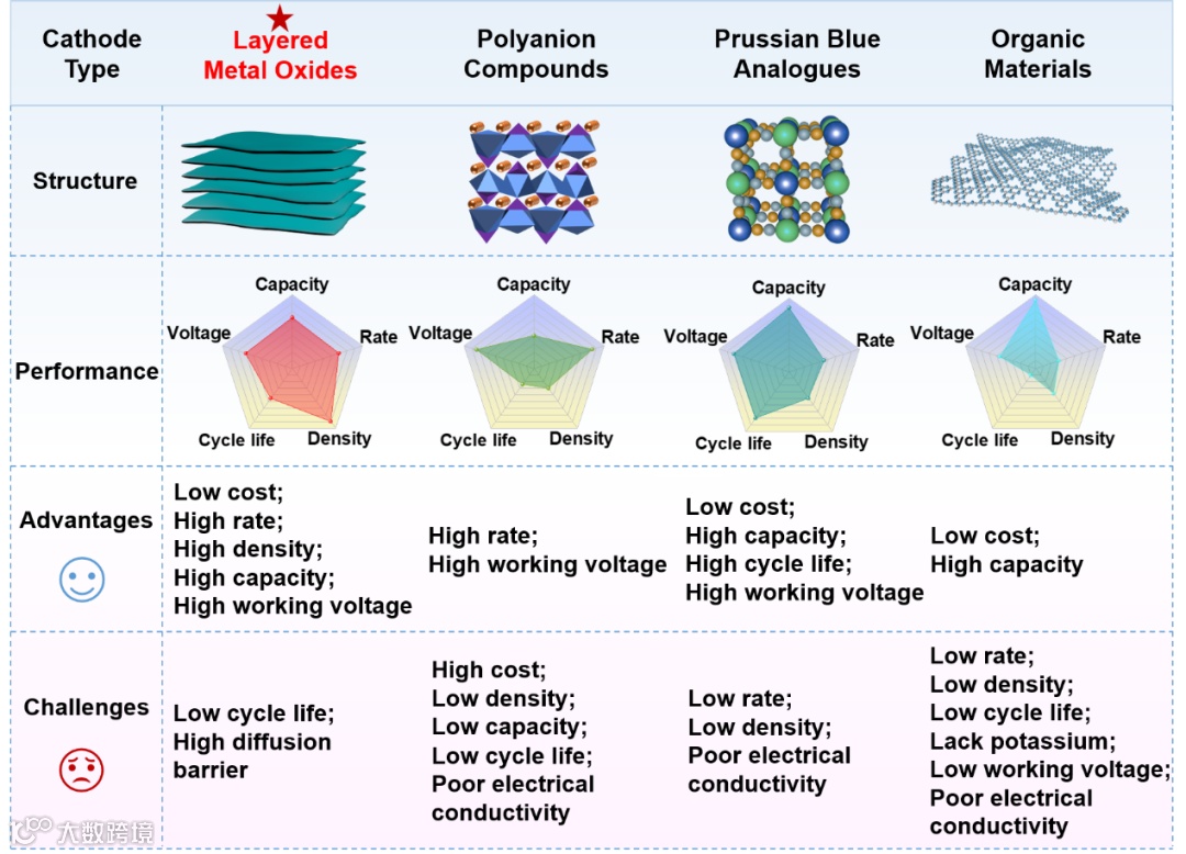 图4. PIBs正极材料的结构、性能及优缺点比较。