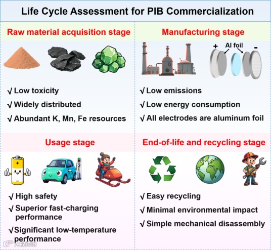 PIBs的商业化评估不仅需考虑电化学性能和生产成本,还需系统分析其全生命周期的环境影响。生命周期评估可量化原料获取、制造、运输、使用及报废处理各阶段的累积环境负荷(图8)。相较于LIBs,钾资源丰富且分布均衡,开采能耗低、温室气体排放少;用于正极的锰、铁层状氧化物环境负荷低、毒性小,加工要求也较低。在制造阶段,PIBs采用铝箔作为正负极集流体,相比铜减少了能耗和排放,并简化了报废回收过程。在使用阶段,得益于钾离子的优良离子动力学与安全特性,PIBs在电网储能等场景下可降低热管理需求和能量损失。在回收环节,缺乏高毒性或高成本过渡金属、以及铝集流体的设计,使得电极回收可采用化学强度较低的湿法冶金工艺。然而,电解液中氟盐及其他持久性离子仍需妥善处理和回收。总而言之,系统的生命周期评估为PIBs商业化提供了科学依据,有助于在保证性能和成本优势的同时,实现环境可持续性和循环利用,为其规模化应用铺平道路。