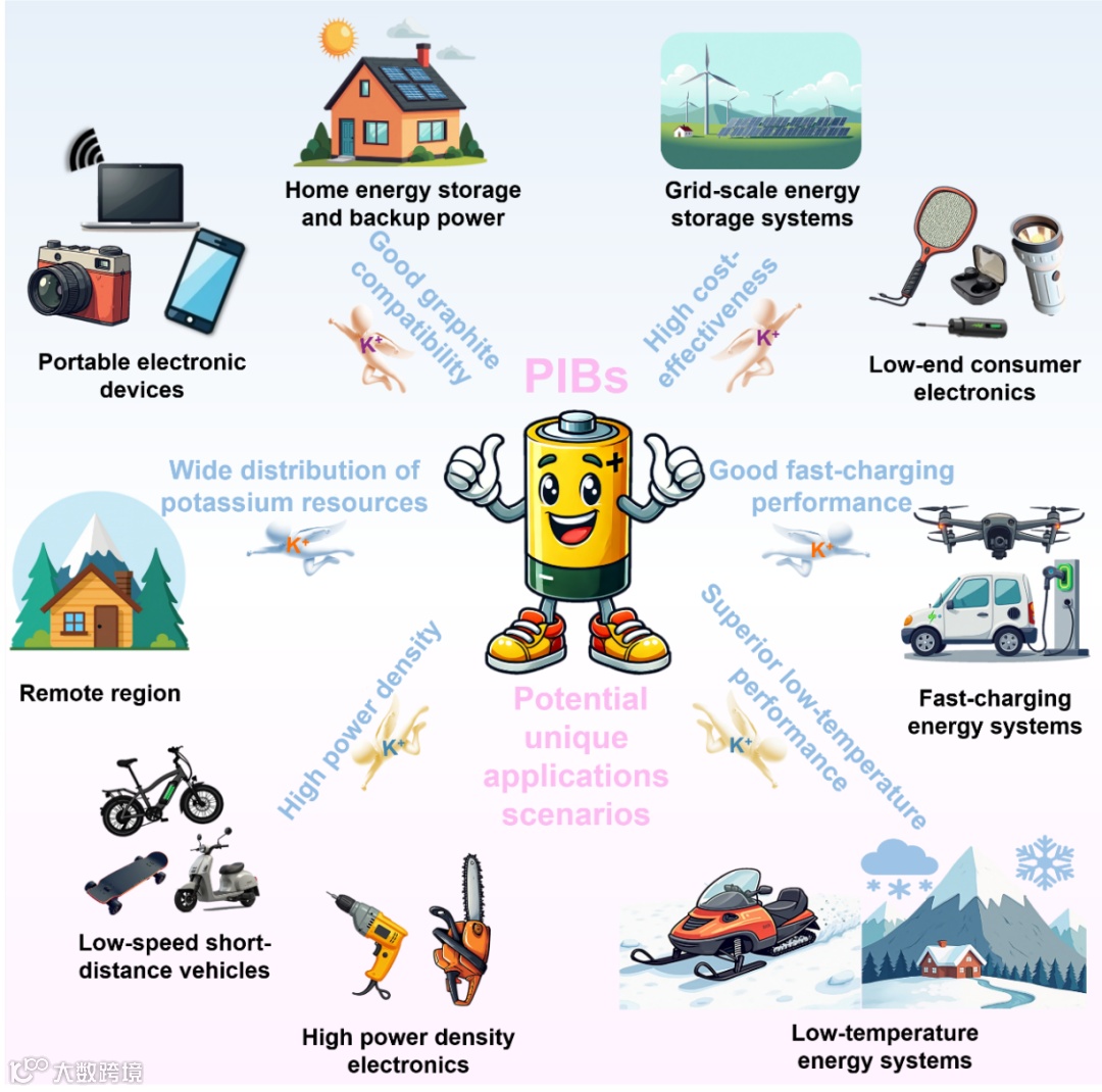PIBs由于工作机理与锂离子电池(LIBs)相似、钾资源储量丰富且分布均衡,具备原材料成本低、供应链安全性高等显著优势,在新一代储能体系中展现出独特潜力。在性能层面,钾离子具有更快的扩散动力学和较低的去溶剂化能垒,使PIBs兼具优异的快充能力、高功率密度和低温性能。与此同时,钾离子能够可逆嵌入石墨形成稳定相,赋予PIBs与现有LIBs体系良好的兼容性,有利于降低技术转换与迭代成本。基于上述优势,PIBs不仅适用于风能、光伏等可再生能源配套的大规模电网储能,也在快充需求突出的交通终端、高功率便携设备、低温或偏远环境下的能源保障系统,以及成本敏感型消费电子领域展现出应用价值(图2)。总体而言,PIBs在资源可获得性、成本效益和应用适应性方面形成了差异化竞争优势,是未来多元化能源存储体系中的候选技术。