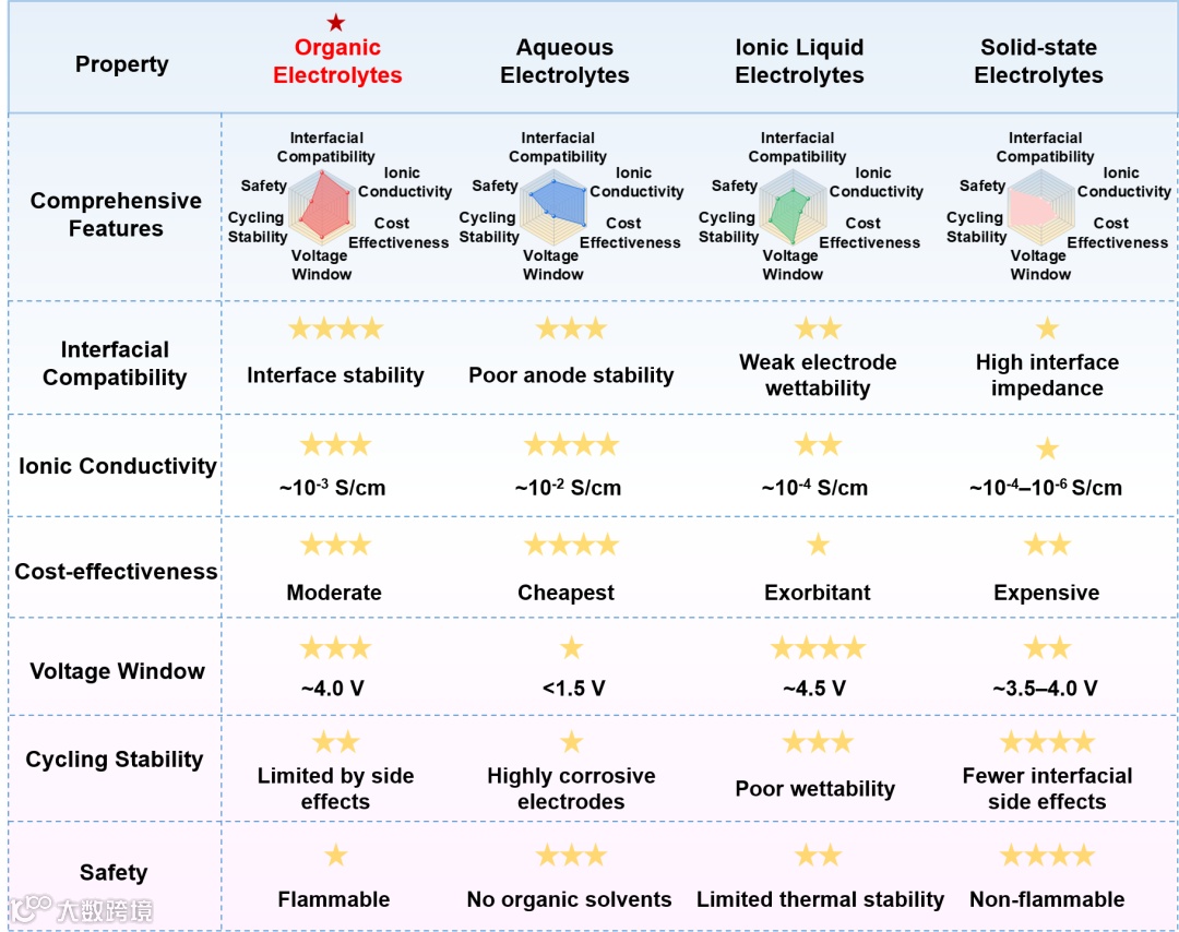 目前研究较为深入的电解液主要包括水系电解液、离子液体电解液、固态电解质和有机电解液(图5)。水系电解液具有成本低、离子电导率高和安全性好的优势,但受限于狭窄的电化学稳定窗口和电极腐蚀问题,难以支撑高能量密度应用;离子液体和固态电解质在热稳定性和本征安全性方面表现突出,被视为下一代高安全储能体系的重要方向,但其高成本、离子传输受限及制备复杂等问题仍制约着实际应用。相比之下,有机电解液兼具较宽的工作电压窗口和良好的电极界面相容性,技术体系成熟,是当前PIBs研究中最具现实可行性的选择。尽管其可燃性带来一定安全隐患,但通过溶剂与钾盐优化、功能添加剂设计以及界面稳定化调控,有机电解液在性能、安全性与成本之间仍具备进一步平衡和提升的空间,是推动PIBs实现应用的关键电解液体系。