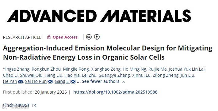 近日,香港理工大学李刚教授与香港科技大学颜河教授、潘世豪教授合作,在材料科学领域知名期刊《Advanced Materials》上发表题为”Aggregation-Induced Emission Molecular Design for Mitigating Non-Radiative Energy Loss in Organic Solar Cells”的研究论文。该工作创新性地提出一种“将聚集诱导发光(AIE)性质引入Y系列非富勒烯受体“的分子设计策略,成功开发出具有AIE特性的受体分子dTPE。研究显示,D18:dTPE二元器件具有1.07 V的高VOC与0.130 eV的超低ΔEnr。通过向高效的D18:L8BO-C4体系中引入dTPE分子,三元器件成功实现了高达0.93 V的VOC与20.51%的光电转换效率。该工作展示了AIE分子设计在抑制有机太阳能电池非辐射复合、突破Y系列受体性能瓶颈方面的重要意义。