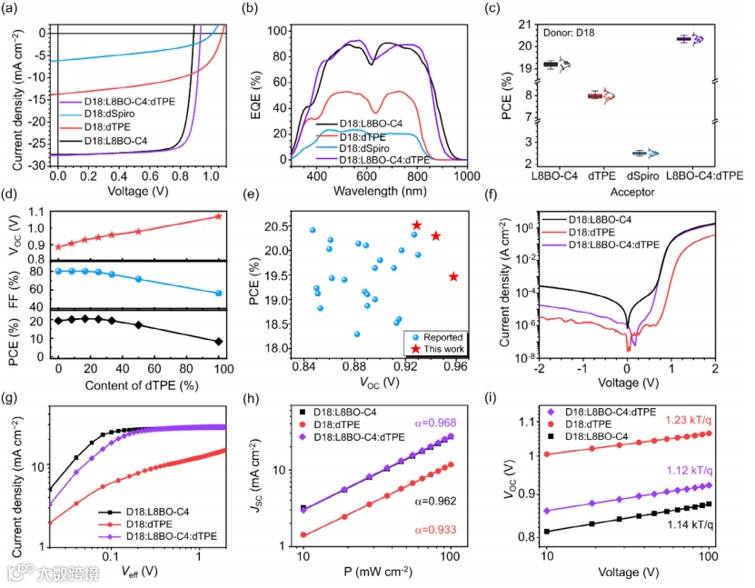 基于D18:dTPE二元器件实现了高达1.07 V的开路电压。将dTPE作为第三组分受体引入高效的D18:L8BO-C4体系,三元器件在VOC由0.88 V提升至0.93 V的同时,PCE由19.37%显著提升至20.51%,证明了AIE受体在开发高性能有机太阳能电池器件中的巨大应用潜力。