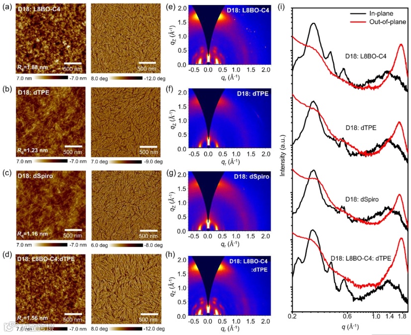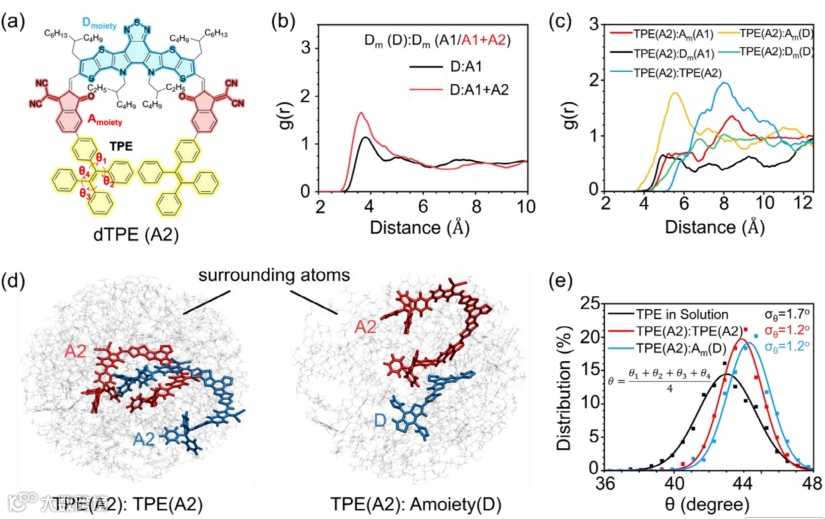 GIWAXS与分子动力学模拟结果显示,尽管dTPE自身的结晶性相比于L8BO-C4较弱,但作为客体掺入后,反而能促进D18/L8BO-C4界面形成更有序的π-π堆积,从而提高了电荷传输效率。这表明dTPE不仅能通过AIE效应抑制非辐射损失,还能优化活性层形貌,从而协同提升器件性能。