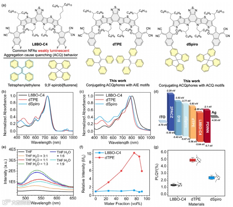 该团队首次将具有典型AIE特性的四苯乙烯(TPE)单元引入Y系列受体端基,设计并合成了dTPE分子。对比高效受体L8BO-C4和结构类似的dSpiro,dTPE在薄膜中表现出明显的AIE行为,光致发光量子产率(PLQY)提升3倍以上,且能够形成有利于电荷分离的级联能级结构。此外,dTPE具有更高的热分解温度和玻璃化转变温度,表现出优异的热稳定性,为后续器件性能优化奠定了光物理基础。