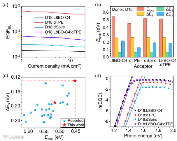对二元/三元器件系统能量损失分析显示,dTPE的AIE性质显著增强了薄膜的固态发光,D18:dTPE二元器件的电致发光外量子效率(EQEEL)高达5.68×10−3,使得相应的非辐射复合损失(ΔEnr)仅为0.130 eV,为目前报道最低。此外,dTPE的引入显著降低了二元器件的ΔEnr(0.219 eV→0.190 eV),使得器件的VOC显著提升,证明了AIE策略是降低有机太阳能电池能量损失的关键机制。