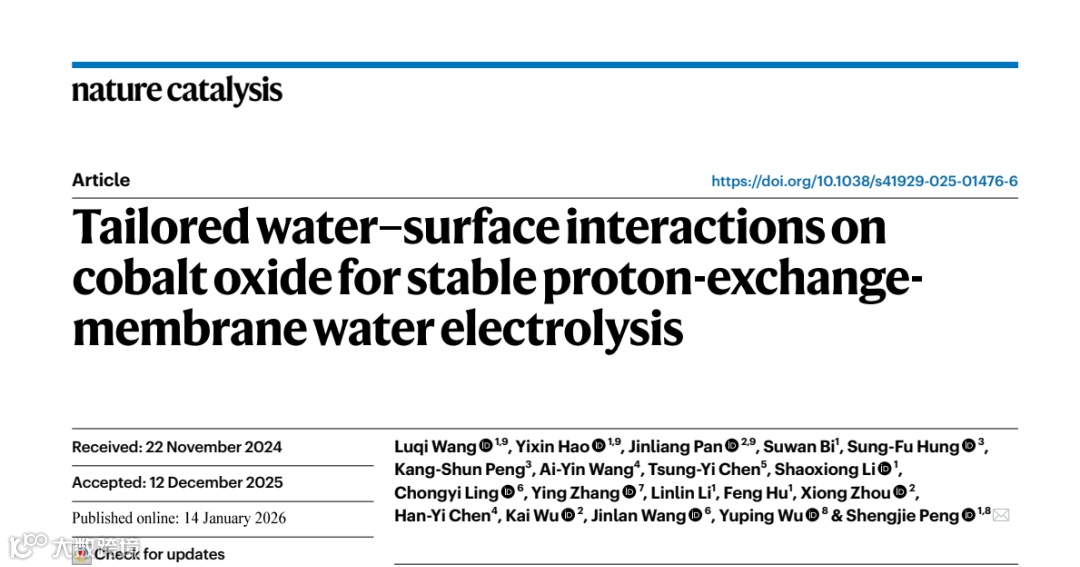 近日,来自东南大学的研究团队,在国际知名期刊Nature Catalysis上发表题为“Tailored water–surface interactions on cobalt oxide for stable proton exchange membrane water electrolysis”的研究论文。该工作聚焦质子交换膜电解水中非贵金属阳极在强酸环境下面临的稳定性难题,从反应界面水分子的结构与行为出发,系统揭示了界面水在金属溶解过程中的关键作用机理。研究通过构建具有特定水分子相互作用的原子位点,调控界面氢键网络与金属溶出行为,并在PEM电解槽中验证了其长期稳定运行性能,为非贵金属阳极的稳定设计提供了有效方法。