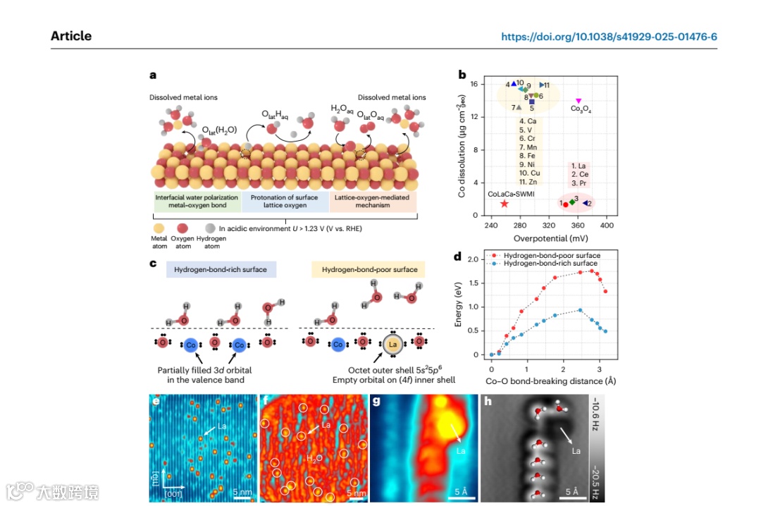 通过在Co3O4表面引入La原子位点,构建对水分子作用能力不同的原子环境,使界面水在原子尺度呈现出非均匀分布。La位点弱化局域氢键富集,缓解水对Co–O键的过度极化,从而有效提高Co位点的抗溶解能力。同时结合可溶出的Ca物种,动态生成高活性的配位不饱和Co位点,实现活性与稳定性的协同调控。