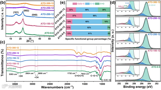 图 2. 纤维素衍生硬碳微观结构与分子超交联拼接机理分析:(a) HC-1400和HC-1400-ATO-250-12的合成过程示意图,(b) 制备的ATO-X-Y的XRD谱图(X:表示热处理温度,Y:表示热处理时间),(c) ATO-X-Y的FTIR光谱,(d) ATO-X-Y的高分辨率c1s光谱,(e) ATO-X-Y的特定功能组百分比。