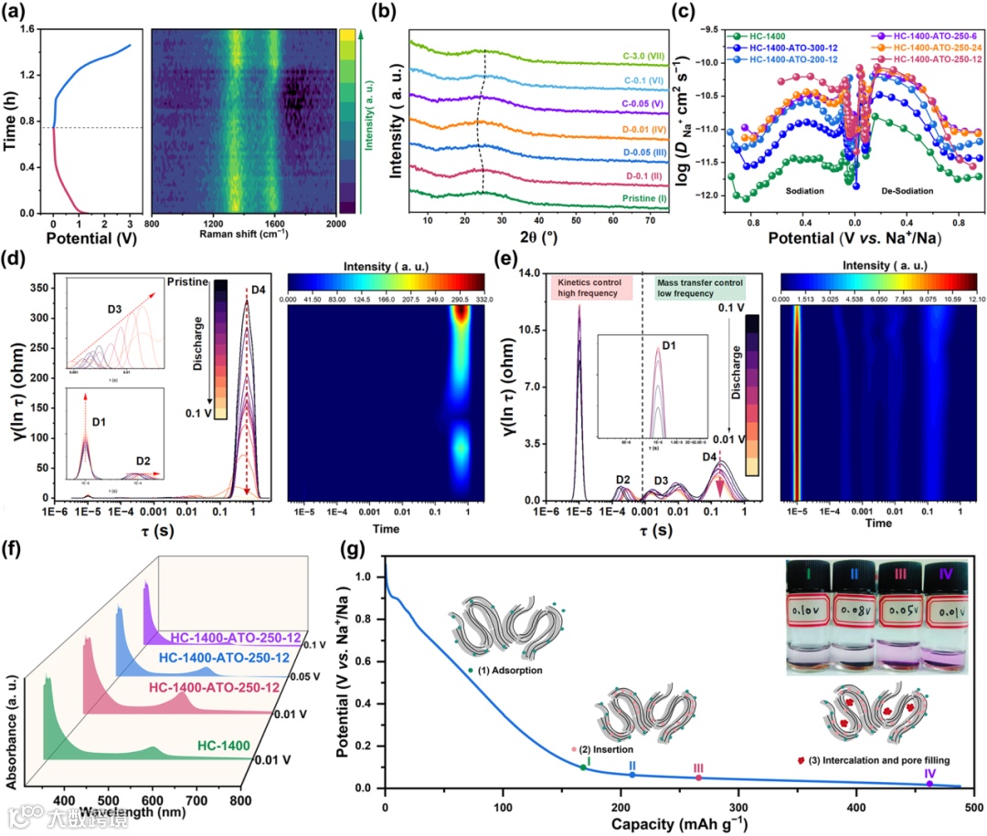 图7. 硬碳钠离子存储机制分析:(a)在 0.3 A g−1的初始充放电过程中,HC-1400-ATO-250-12的原位拉曼图谱,(b)在首次充放电过程中,HC-1400-ATO-250-12的1原位XRD图谱,(c)根据 GITT曲线计算出的所制备 HC的钠离子扩散系数,(d、e)所制备HC的原位DRT分析,(f)在不同截止电压下,HC-1400-ATO-250-12和HC-1400电极的紫外-可见光谱图,(g)HC-1400-ATO-250-12中高度可逆的钠储存机制的展示。