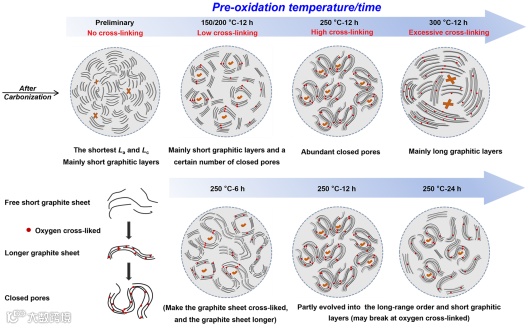 封闭孔隙结构形成涉及两个关键要素:(I)HC中的石墨薄片足够长,(II)HC中的石墨薄片具有合适的堆叠厚度,能够有效地弯曲并形成封闭结构单元。具体来说,在热解过程中,纤维素交联程度的调节对于实现闭孔结构至关重要。因为石墨片可以通过交联相互堆叠和伸长,然后形成长距离的“石墨片组装体”。它作为封闭孔隙的壁,收缩后形成封闭孔隙结构。同时,不同的预氧化温度会显著影响石墨薄片的交联度,从而导致La长度和Lc堆叠厚度不同,进而影响闭合孔隙的形成。闭孔的演化过程如下:当石墨片的交联程度相对较低时,形成的石墨片组装体不够长,阻碍了闭合孔隙的生成。此外,如果石墨片交联过度,石墨片之间的堆叠厚度会变得太厚,导致石墨片组装体难以弯曲并形成封闭的单元结构。同时,预交联过程的碳化时间也会影响石墨薄片的长度。即使继续延长预交联时间,内部依旧以封闭孔结构为主,(III)预交联温度限制了石墨片组装体的堆叠厚度,导致继续延长时间,封闭孔依旧占主要。