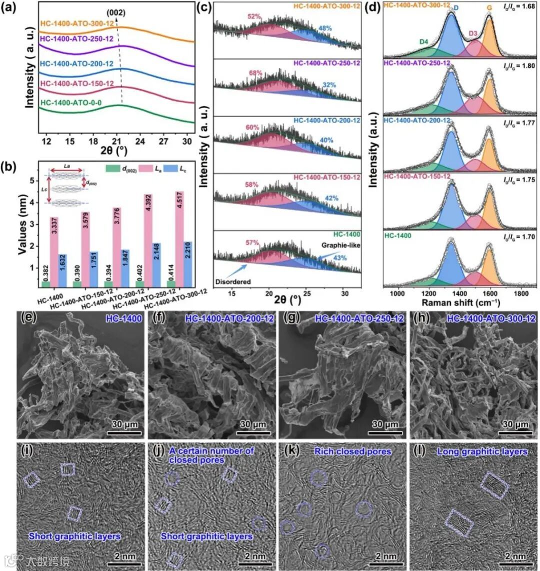 图3. 不同预交联程度的硬碳微观结构表征和形貌表征:(a)所制备的HC-1400-ATO-X-Y的XRD 图谱,(b)所制备的HC中d(002)、La和Lc的变化情况,(c)所制备的HC的d(002)峰的峰形拟合。(d)所制备的HC的拉曼光谱及拟合曲线。(e-h)所制备的HC的SEM图像。(i-l)所制备的HC的TEM图像。