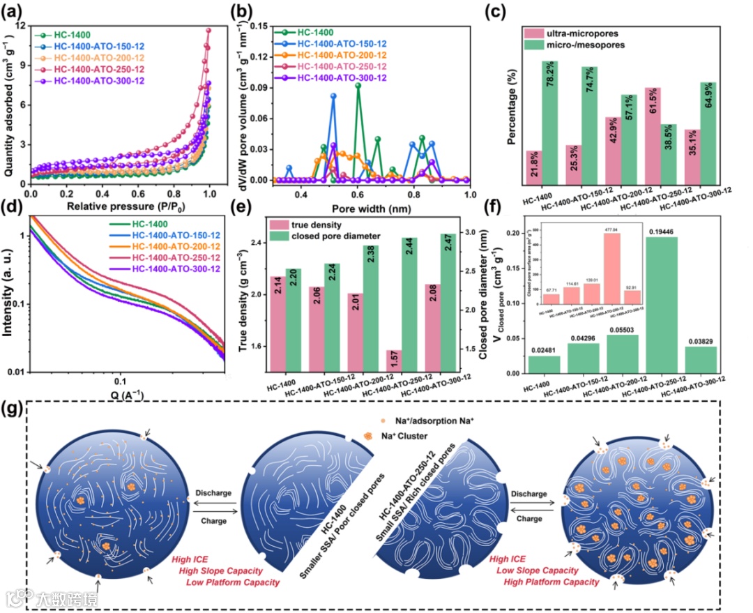 图4. 不同预交联程度的硬碳孔隙结构分析:(a)所制备的HC的N2吸附/脱附等温线图,(b)通过CO2吸附/脱附等温线所制备的HC的孔径分布,(c)所制备的HC中超微孔和微/中孔的体积分数模式,(d)所制备的HC的SAXS 图谱,(e)所制备的HC的真实密度和闭合孔径,(f)通过真实密度测试确定的闭合孔体积(插图为所制备HC的闭合孔表面积),(g)HC-1400和HC-1400-ATO-250-12的闭合孔结构钠离子存储示意图。