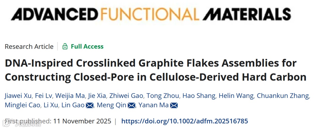 近日,来自湖北汽车工业学院的马亚楠教授、秦蒙博士及高林副教授,在国际材料领域顶级期刊Advanced Functional Materials上发表题为“DNA-Inspired Crosslinked Graphite Flakes Assemblies for Constructing Closed-Pore in Cellulose-Derived Hard Carbon”的观点文章。该研究受DNA分子交联过程的启发,采用超交联拼接策略,所制备出的钠离子电池负极材料具有优异的倍率能力和循环性能,这项研究揭示了在分子尺度层面上形成闭合超微孔隙的过程,为钠离子电池硬碳负极材料的设计提供了研究思路。