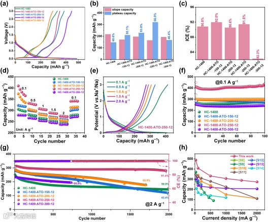 图6. 所制备的 HC 负极的电池性能:(a)在 0.03 A g−1 电流下的GCD曲线,(b)斜坡和平台区域对初始放电容量的贡献,(c)五个样品的ICE,(d)不同电流密度下的速率性能和(e)所制备HC的GCD曲线,(f)在0.1 A g−1电流下的所制备HC的循环性能,(g)在 2 A g−1电流下的五个样品的长循环性能,(h)与之前报道的HC负极材料的倍率性能的比较。