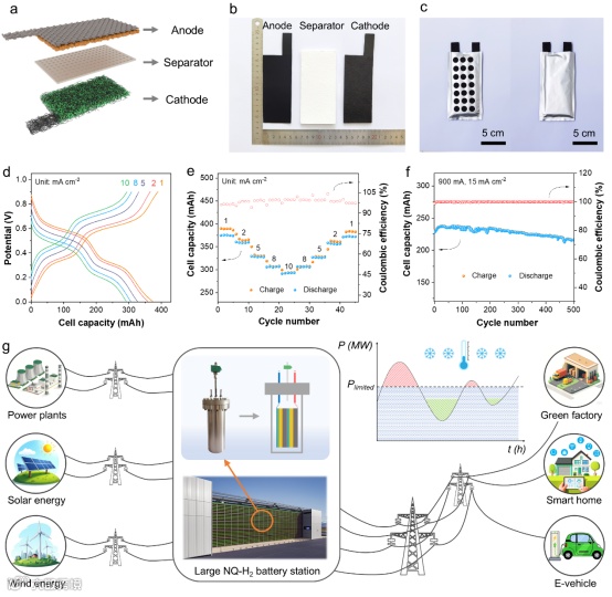 图5. 萘醌-H2软包电池的制备、电化学性能展示、及应用展望。