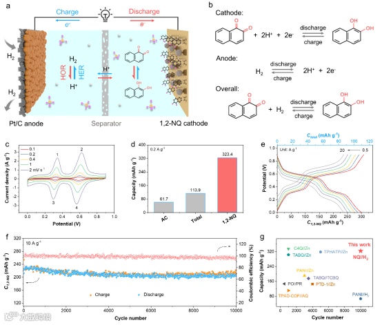 图3. 萘醌-H2二次电池的工作原理及电化学性能。