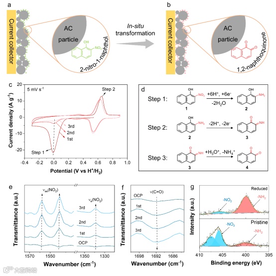 1,2-萘醌(12-NQ)分子可以通过烯醇/羰基转换反应实现高度可逆的质子存储,具有高达339 mAh g-1的理论比容量,是有机正极的理想选择之一。但是当前12-NQ的制备主要依靠化学途径氧化对应的前驱体酚类,成本高昂,不利于电池的规模化应用。在本工作中,作者采用电化学原位转化策略(即循环伏安转化法),在封装好的氢气电池内部,将廉价的前驱体材料2-硝基-1-萘酚(2N1N)成功转化为高附加值的12-NQ目标分子。这种转化得到的12-NQ即可作为二次氢气电池的有机正极,在后续测试中持续、可逆地发生烯醇/羰基转换反应来贡献容量。工况状态下的同步辐射红外光谱(SR-FTIR)和非原位XPS等表征手段全面地佐证了从2N1N到12-NQ的转化过程。