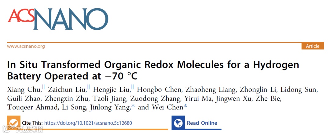 近日,中国科学技术大学陈维教授和深圳大学杨金龙副教授合作,在国际知名期刊ACS Nano上发表题为“In Situ Transformed Organic Redox Molecules for a Hydrogen Battery Operated at -70 °C”的研究论文。该论文提出一种“电化学原位转化”策略,将廉价的2-硝基-1-萘酚前驱体通过电化学方法原位转化为高附加值1,2-萘醌目标分子,从而制造出萘醌-H2二次电池。该电池体系表现出高达323.4 mAh g-1的比容量和在-70 ℃低温环境下的工作能力,为低温场景下的规模化储能提供了可行的解决方案。
