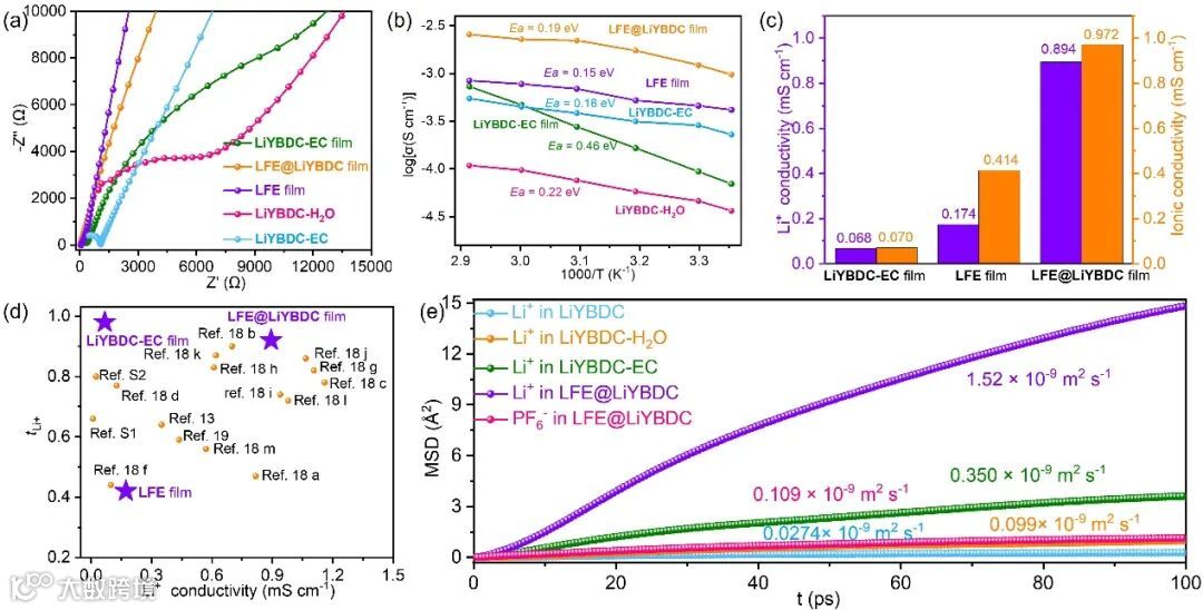 图4. (a) LiYBDC-H2O、LiYBDC-EC、LiYBDC-EC薄膜、LFE 薄膜及LFE@LiYBDC薄膜在25℃下的奈奎斯特图。(b) 基于MOF的单层离子导体电池的阿伦尼乌斯图及其计算活化能。(c) LiYBDC-EC薄膜、LFE 薄膜及LFE@LiYBDC薄膜的离子电导率与锂离子电导率。(d) 本研究中锂离子导体的Li⁺转移数与锂离子电导率与其他已报道研究的对比。(e) LiYBDC、LiYBDC-H2O、LiYBDC-EC、LFE@LiYBDC及PF6-中Li⁺的MSD随模拟时间变化的函数关系(以LFE@LiYBDC为基准)。