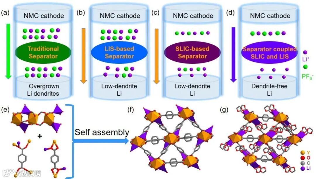 图1. HV-LMB中树枝状锂生长的示意图:(a) 传统隔膜,(b) LIS基隔膜,(c) SLIC基隔膜,(d) SLIC与LIS耦合隔膜。(e) LiYBDC-H2O的构建单元及(f)三维结构。(g) LiYBDC-EC的三维结构。