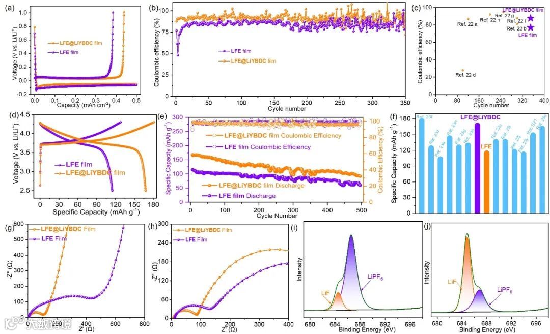 图6. (a) Cu|Li电池在0.5 mAh cm−2电流密度下,LFE@LiYBDC薄膜与LFE薄膜的电压曲线。(b) Cu|Li电池在0.5 mAh cm−2电流密度下,LFE@LiYBDC薄膜与LFE薄膜的恒电流循环性能。(c) 基于LFE@LiYBDC的电池循环时长与库仑效率,并与文献报道的电池进行对比。(d) LiNi1/3Co1/3Mn1/3O2|Li电池在2.0 mg cm−2电流密度下,LFE@LiYBDC薄膜与LFE薄膜的电压-容量曲线。(e) LiNi1/3Co1/3Mn1/3O2|Li电池在2.0 mg cm−2电流密度下,LFE@LiYBDC薄膜与LFE薄膜的恒电流容量循环性能。(f) 基于LFE@LiYBDC的电池比容量,并与文献报道的电池进行对比。LiNi1/3Co1/3Mn1/3O2|Li电池在(g) 1次循环和(h) 100次循环后,LFE薄膜与LFE@LiYBDC薄膜的电化学阻抗谱。(i) 100次循环后,LFE@LiYBDC薄膜与(j) LFE薄膜的LiNi1/3Co1/3Mn1/3O2|Li电池中固体电解质界面的F1s XPS。