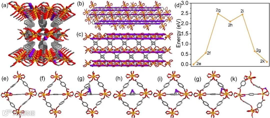 图2. LiYBDC-H2O的仿生锂离子链沿(a) a轴、(b) b轴和(c) c轴的视图。锂离子(d) 转移能垒及(e-k)转移过程。