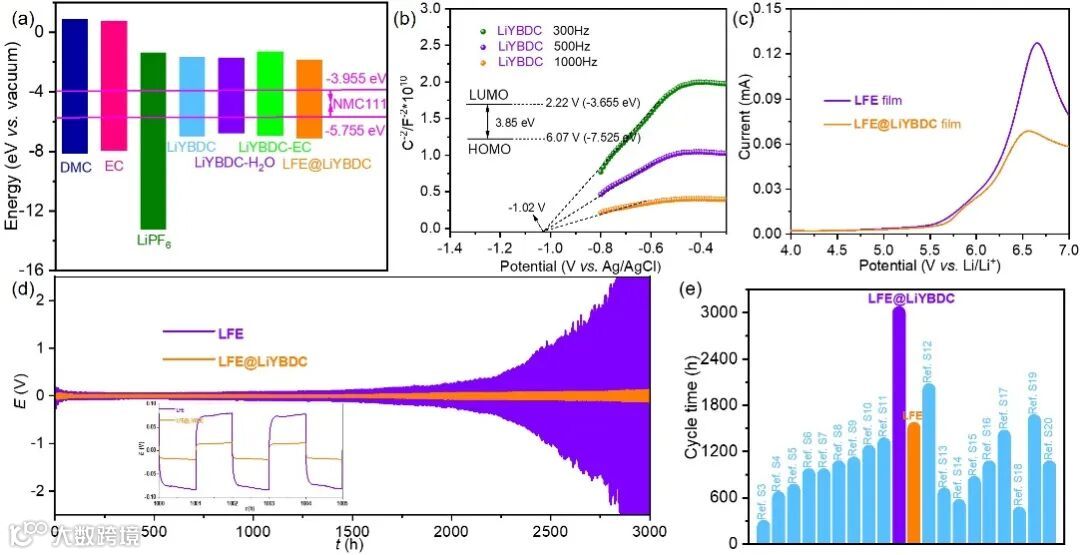 图5. (a) 溶剂、锂盐及LiYBDC/LiYBDC-H2O/LiYBDC-EC/LFE@LiYBDC体系的前线轨道能级。(b) LiYBDC的莫特-肖特基曲线。(c) LFE@LiYBDC薄膜与LFE 薄膜的锂箔LSV曲线。(d) LFE@LiYBDC薄膜与LFE薄膜在0.5 mAh cm−2电流密度下的对称锂离子电池电压曲线(插图:锂循环1000-1005小时期间锂沉积与剥离的放大示意图)。(e) LFE@LiYBDC基电池的循环寿命,并与文献报道的电池进行对比。