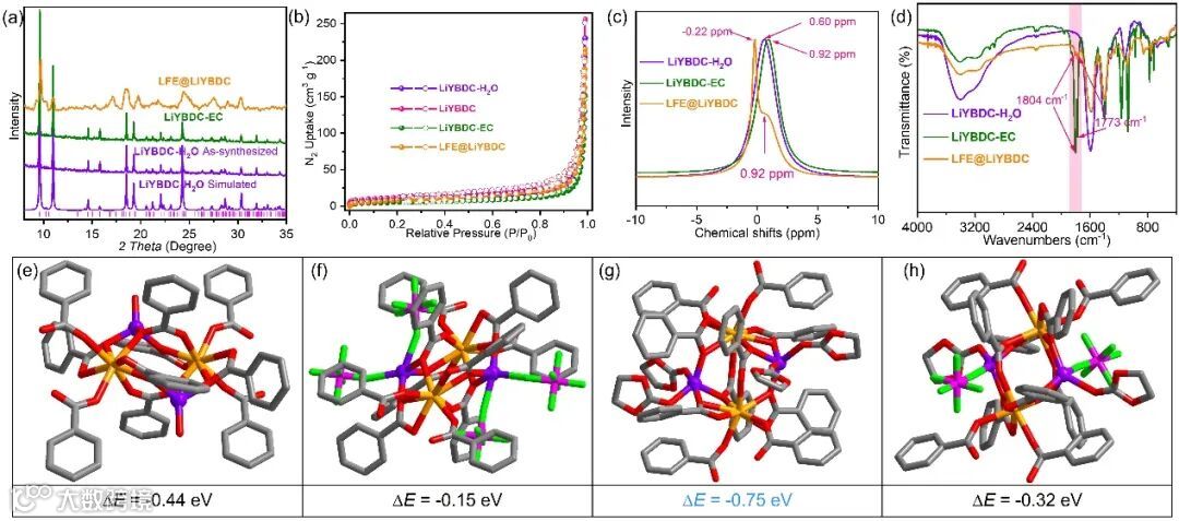 图3. (a) LiYBDC-H2O、LiYBDC-EC和LFE@LiYBDC的 PXRD图像,(b) LiYBDC-H2O、LiYBDC、LiYBDC-EC和 LFE@LiYBDC在77 K下的N2吸附(实心)与脱附(空心),(c) LiYBDC-H2O、LiYBDC-EC和 LFE @LiYBDC的7Li固态NMR,(d) LiYBDC-H2O、LiYBDC-EC和 LFE@LiYBDC的FT-IR光谱。计算结果包括LiYBDC吸附的结合能和配位模式:(e) 水,(f) 2PF6–,(g) 2EC,以及(h) EC/PF6–。