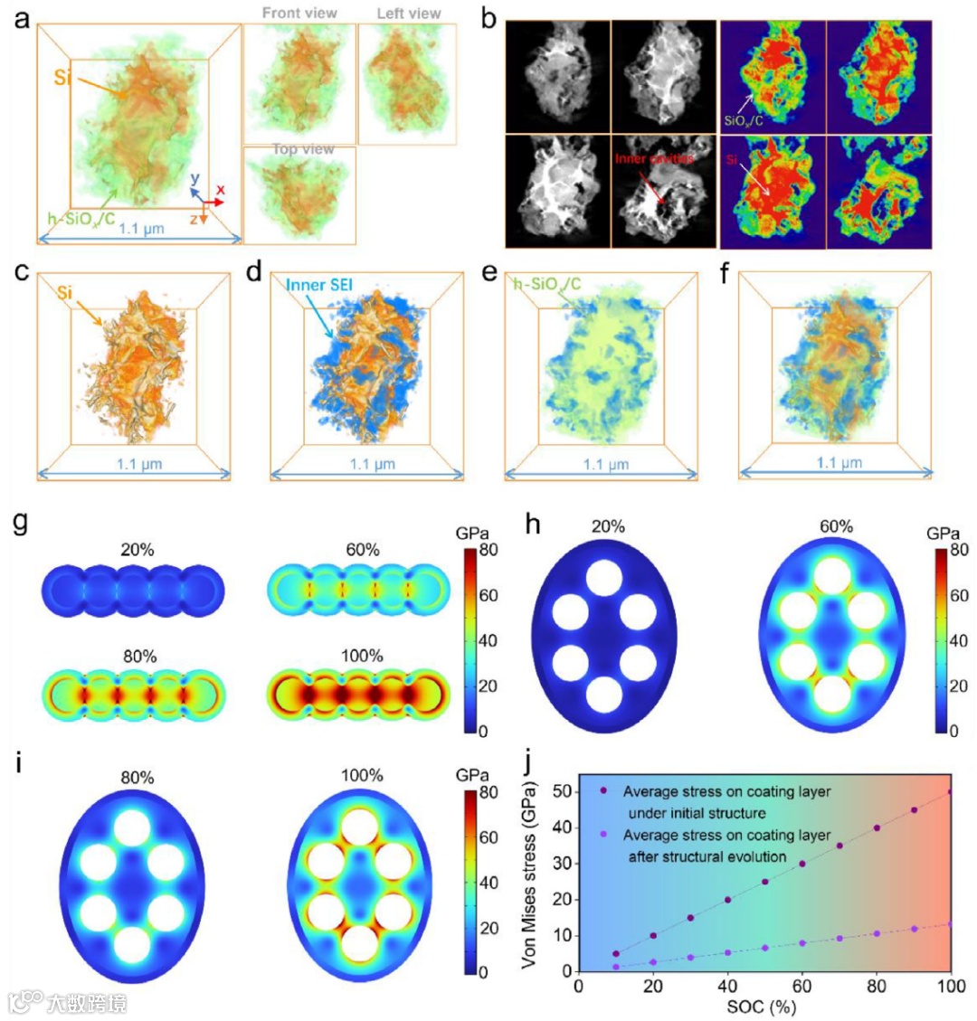 图6. 自适应演变后的复合硅基负极材料的三维重构解析和有限元模拟分析