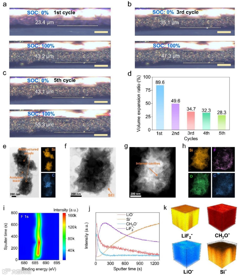 图5. Si@h-SiOx/C负极的原位光镜表征及循环后的结构/界面表征