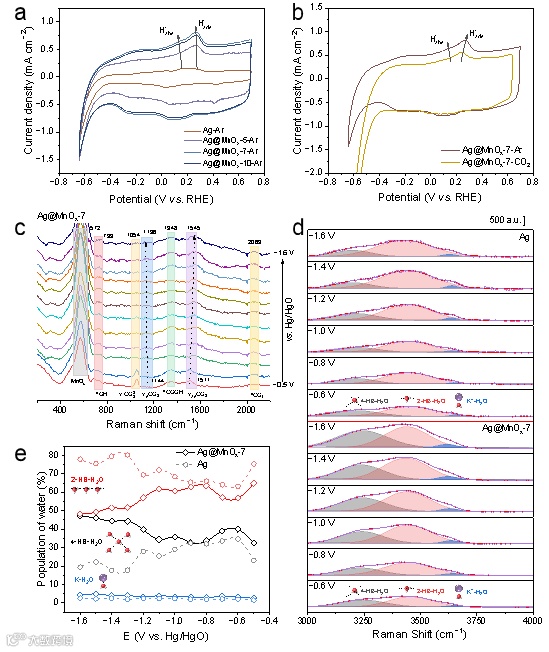 图3. 提供活性氢促进CO2RR生成CO。(a) Ag、Ag@MnOx-5、Ag@MnOx-7和Ag@MnOx-10在Ar饱和的0.5 M KHCO3中的CV曲线。(b) Ag@MnOx-7在Ar和CO2饱和的0.5 M KHCO3中的CV曲线。(c) Ag@MnOx-7在不同电势下的原位表面增强拉曼光谱。(d) 在不同电势下,Ag和Ag@MnOx-7上4-HB-H2O、2-HB-H2O和K-H2O的三种O-H伸缩振动模式(νO-H)的高斯拟合。(e) 根据原位拉曼光谱得到的Ag和Ag@MnOx-7上界面水的电势依赖性数量。