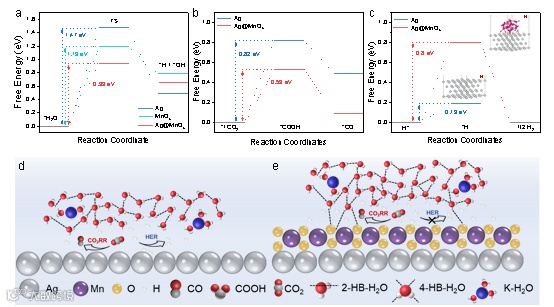 图4. 密度泛函理论计算。(a)Ag、MnOx和Ag@MnOx上水分解的自由能曲线。(b)Ag和Ag@MnOx-7上电催化CO2RR的自由能曲线;(c)Ag和Ag@MnOx-7上HER的自由能曲线。插图为*H吸附在Ag和Ag@MnOx-7上的结构模型。(d)Ag表面和(e)Ag@MnOx表面上界面水构型的示意图。