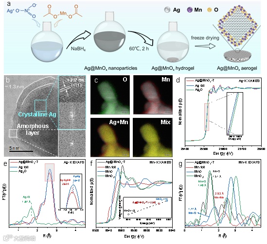 研究团队通过湿化学共还原法制备了具有三维多孔结构的Ag@MnOx核壳气凝胶。表征结果显示,催化剂内核为晶态Ag,表面包裹着约1.3 nm厚的无定形MnOx层。X射线吸收光谱等分析表明,Ag核与MnOx壳层之间存在电子转移,Mn的平均价态为+3.58。这种独特的核壳结构为界面水调控提供了基础。