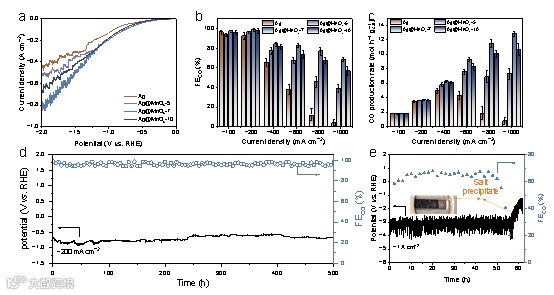 图2. 不同催化剂在流动池中电催化CO2RR的活性评估。(a)线性扫描伏安(LSV)曲线,(b)CO的法拉第效率,以及(c)Ag、Ag@MnOx-5、Ag@MnOx-7和Ag@MnOx-10在流动池中的CO生成速率。Ag@MnOx-7在(d)−200 mA cm−2下持续500小时和(e)−1 A cm−2下持续50小时的耐久性测试。
