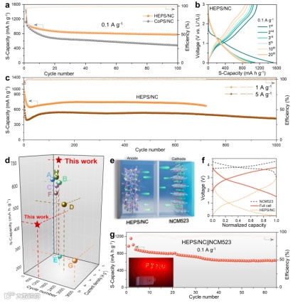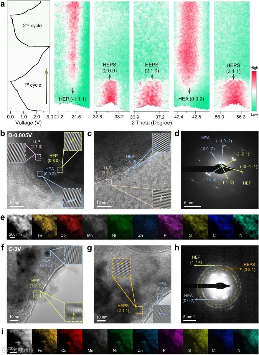 HEPS在充放电中发生可逆电化学重构原位生成高熵合金,M-N键持续锚定纳米颗粒,NC 基质抑制元素偏析,为优异循环稳定性提供结构支撑。