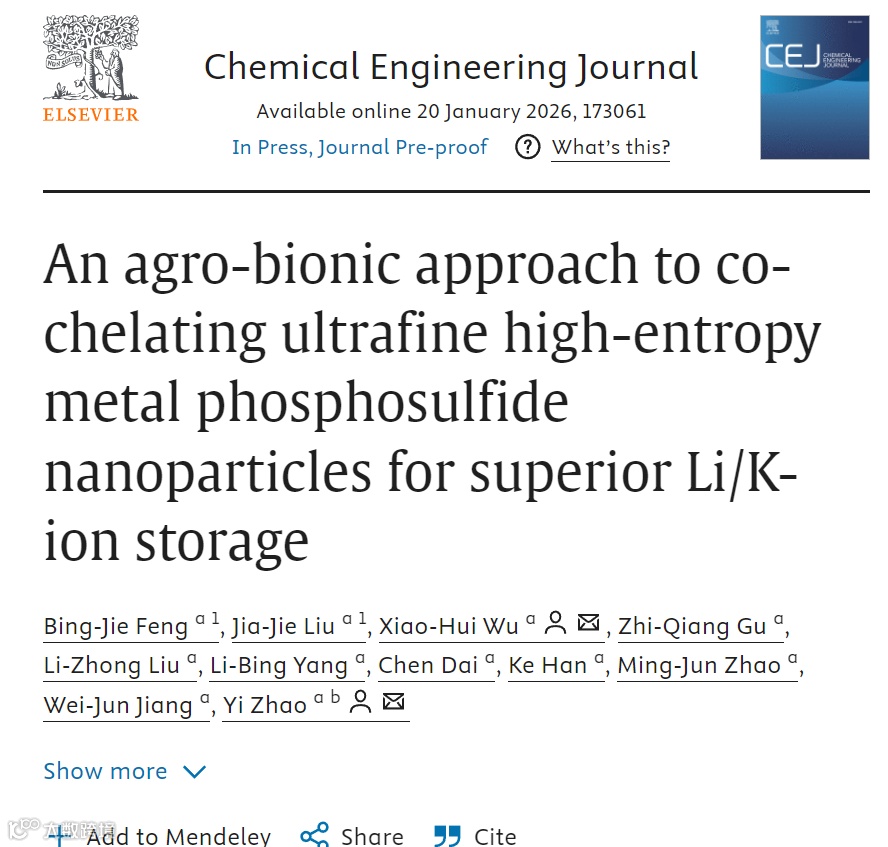近日,福建师范大学吴晓慧副教授联合赵毅教授团队在Chemical Engineering Journal期刊上发表题为 “An agro-bionic approach to co-chelating ultrafine high-entropy metal phosphosulfide nanoparticles for superior Li/K-ion storage” 的文章。该文章创新性地提出农业仿生共螯合策略,解决传统高温合成高熵金属磷硫化物(MPS)面临的颗粒粗化、相分离难题。合成出约3.5 nm的超细高熵金属磷硫化物纳米颗粒(HEPS),并通过强M-N键均匀锚定在氮掺杂碳基质中(HEPS/NC)。高熵效应与共螯合效应的协同作用,不仅提升锂/钾离子吸附与扩散能力、抑制多硫化物穿梭,还增强材料导电性与结构稳定性,显著优化离子扩散动力学。值得注意的是,HEPS/NC作为锂离子电池(LIBs)阳极时,5 A g-1下循环1000次容量保持率达87.5%,并且HEPS/NC||PB组成的柔性袋式电池在折叠状态下仍能稳定供电。从材料合成与储能应用角度来看,该农业仿生策略为熵稳定硫属化物提供了通用合成范式,所制备的HEPS/NC阳极在多价离子电池体系中展现出卓越适配性,为下一代高容量、高稳定性储能技术提供了关键支撑。