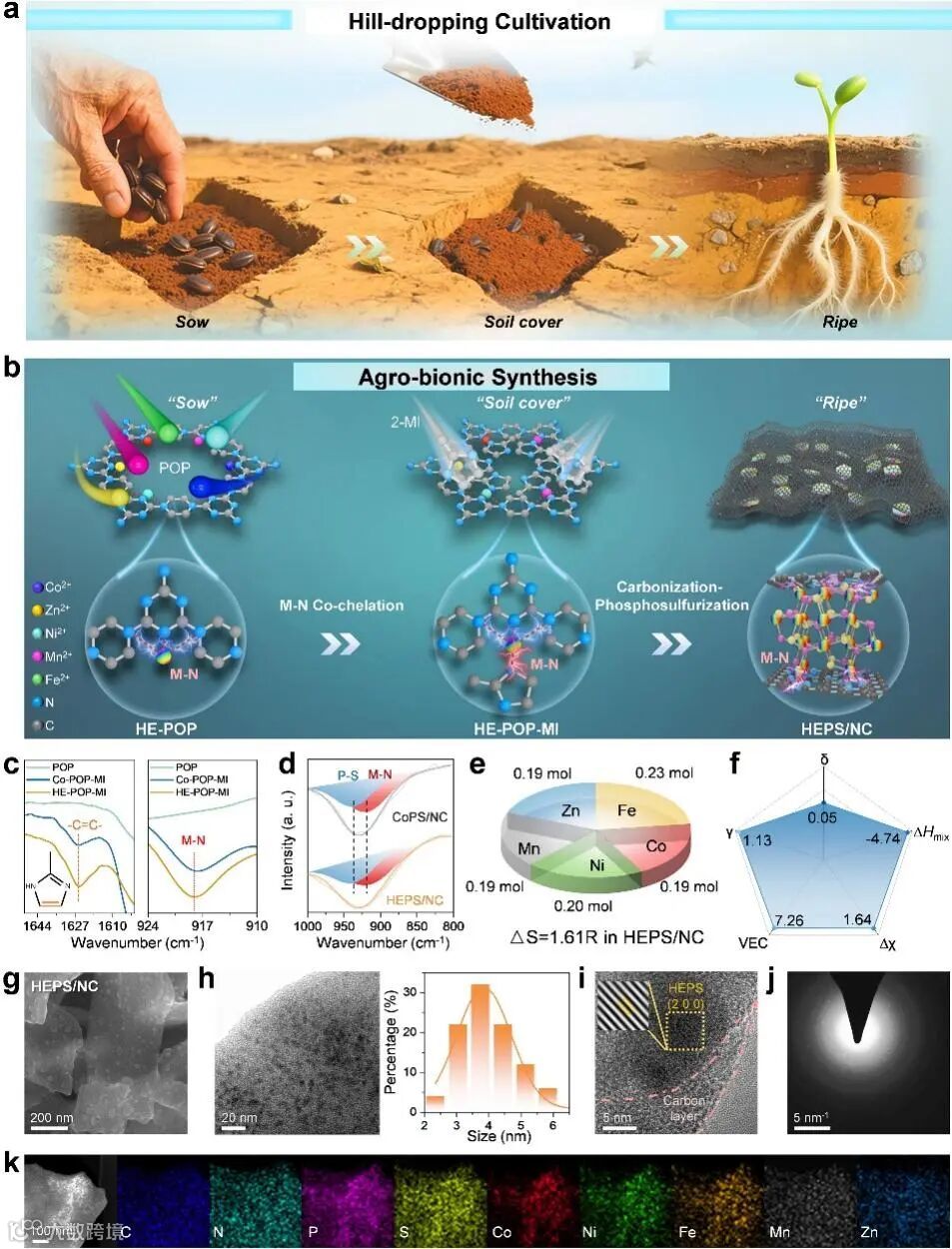 提出农业仿生共螯合合成策略,模仿“点播”种植原理,以富氮多孔有机聚合物(POP)为“土壤”、2-甲基咪唑(2-MI)为“覆土”,通过双螯合剂协同作用固定五种金属离子,经碳化-磷硫化一步制备 HEPS/NC,为高熵材料合成提供通用合成范式。