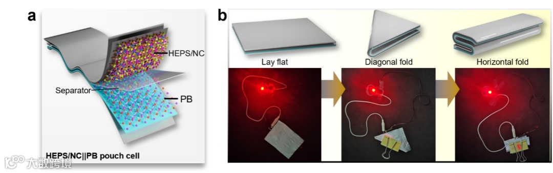 应用场景拓展至柔性储能领域,HEPS/NC||PB柔性袋式电池在折叠状态下仍能稳定供电,适配柔性可穿戴电子设备,为高容量、高稳定性柔性储能技术提供材料支撑。
