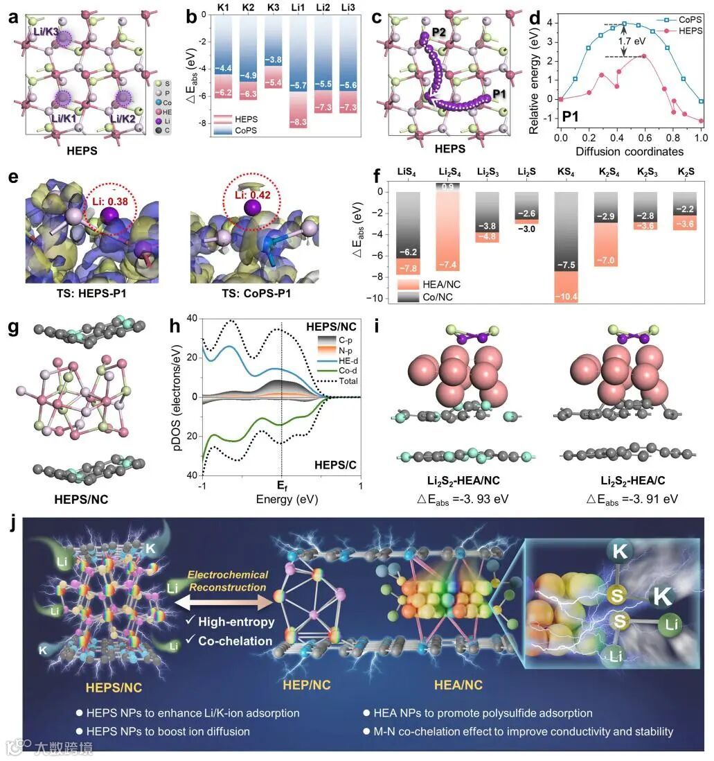 揭示高熵效应与共螯合效应的协同机制,高熵效应提升锂/钾离子吸附与扩散、抑制多硫化物穿梭,M-N 键增强电子传导与结构完整性;电化学重构形成的高熵合金(HEA)进一步优化反应动力学,三者协同突破传统MPS材料的性能瓶颈。