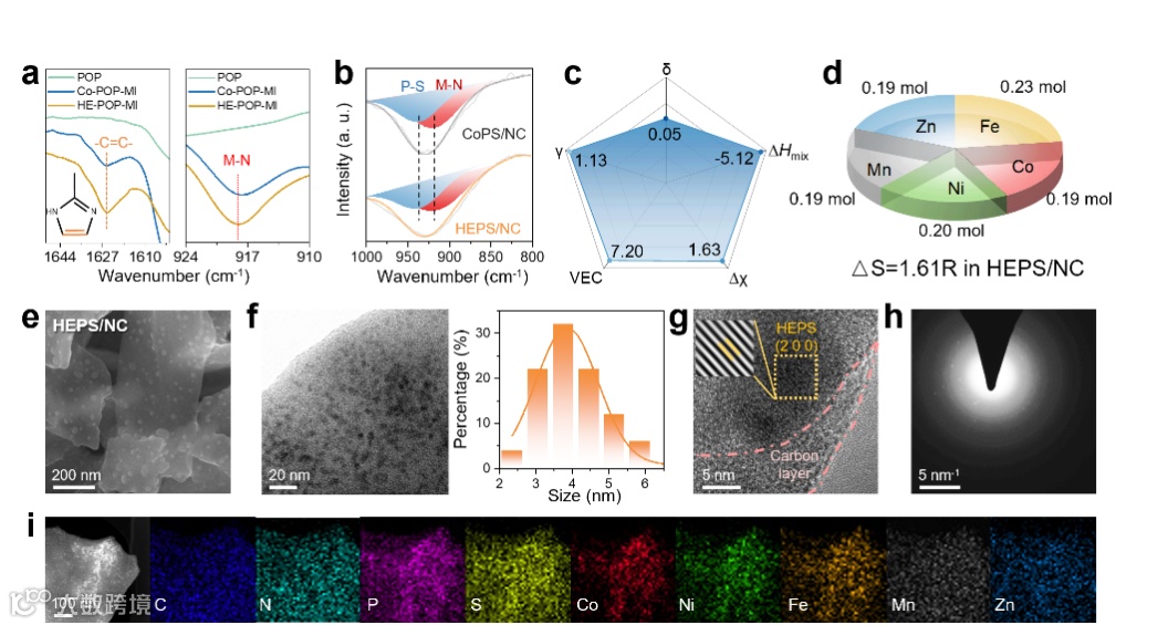 材料结构新颖,构建超细高熵+强键锚定复合结构约3.5 nm的HEPS纳米颗粒通过强M-N键均匀嵌入氮掺杂碳基质,实现高纯度单相结构,解决传统高温合成的颗粒粗化、相分离难题。