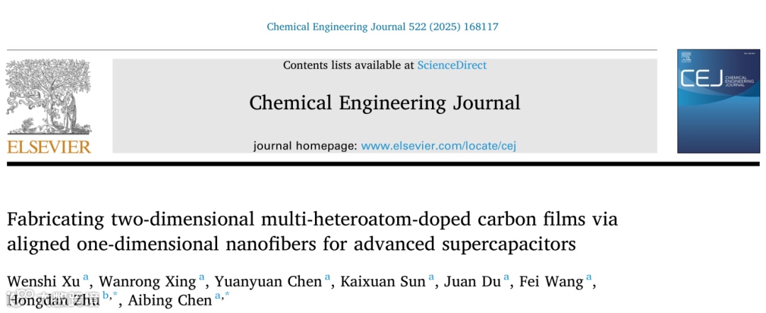 近日,河北科技大学陈爱兵教授团队在国际期刊Chemical Engineering Journal上发表题为“Fabricating two-dimensional multi-heteroatom-doped carbon films via aligned one-dimensional nanofibers for advanced supercapacitors”的研究论文。该研究提出一种创新策略,通过静电纺丝结合高温碳化工艺,将取向一维聚丙烯腈 / 磺丁基醚-β-环糊精钠盐(PAN/SCD)纳米纤维转化为二维氮氧硫三掺杂碳膜。这种 1D 到 2D 的结构转变,结合多杂原子协同掺杂效应,显著提升了碳材料的电化学性能,为高性能超级电容器电极材料的制备提供了思路。