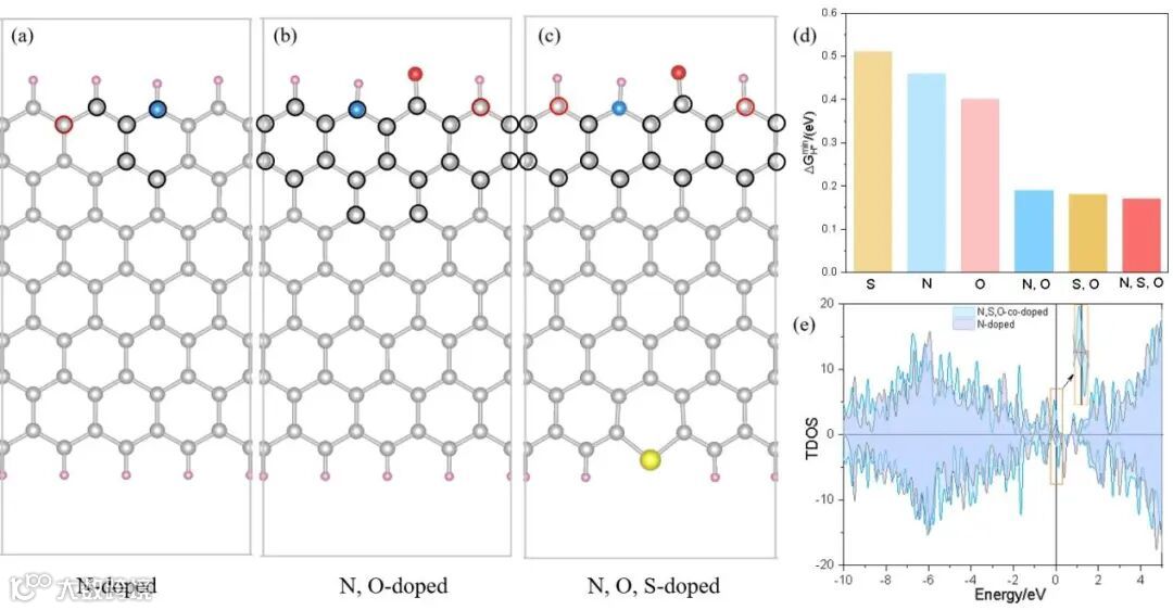 为深入理解多杂原子掺杂的作用机制,研究团队构建了 19 种可能的杂原子掺杂模型,计算 了280 个吸附位点的 H⁺吸附吉布斯自由能(∆GH*)。单掺杂对比:氧掺杂体系的最低 ∆GH*(0.40 eV)低于氮掺杂(0.46 eV)和硫掺杂(0.51 eV),表明氧掺杂更易促进电荷存储。双掺杂协同:氮 - 氧共掺杂体系的最低∆GH*降至 0.19 eV,活性区域为相邻 N-H 与 C=O 键边缘的间位 C 原子。三掺杂突破:氮 - 氧 - 硫三掺杂体系的最低 ∆GH* 进一步降至 0.17 eV,且费米能级附近电子态密度显著提升,证实多掺杂通过协同调控电子结构,降低离子吸附能垒,提升电荷存储效率。