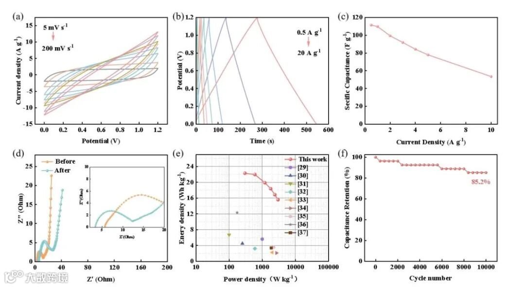 以 PAN/SCD-0.6 为电极组装对称超级电容器,表现出卓越性能。功率密度为 300 W/kg 时,能量密度达 22.26 Wh/kg,优于多数已报道的碳基对称超级电容器。2 A/g 电流密度下循环 10000 次后,电容保持率仍达 85.2%,归因于二维结构与多掺杂对碳骨架稳定性的协同增强。循环后阻抗增长缓慢,证实界面稳定性优异。