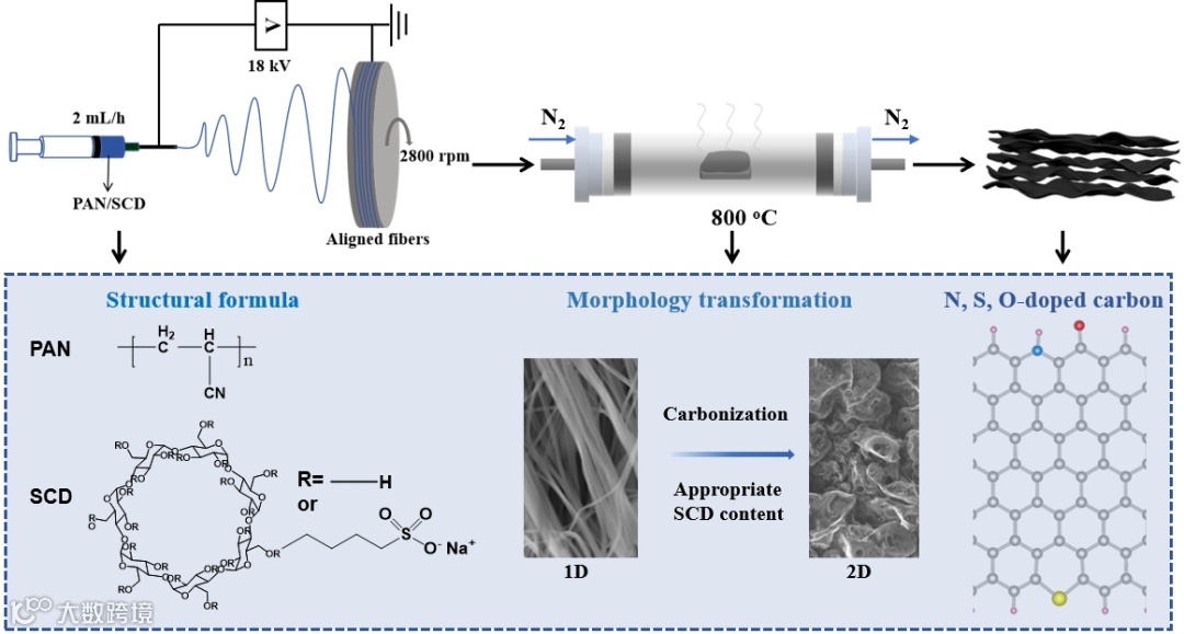 图1. PAN/SCD-x 碳膜的制备流程、形貌演变及杂原子掺杂。