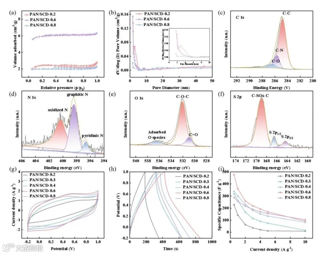 图3. PAN/SCD-x 的表征及三电极电化学性能。