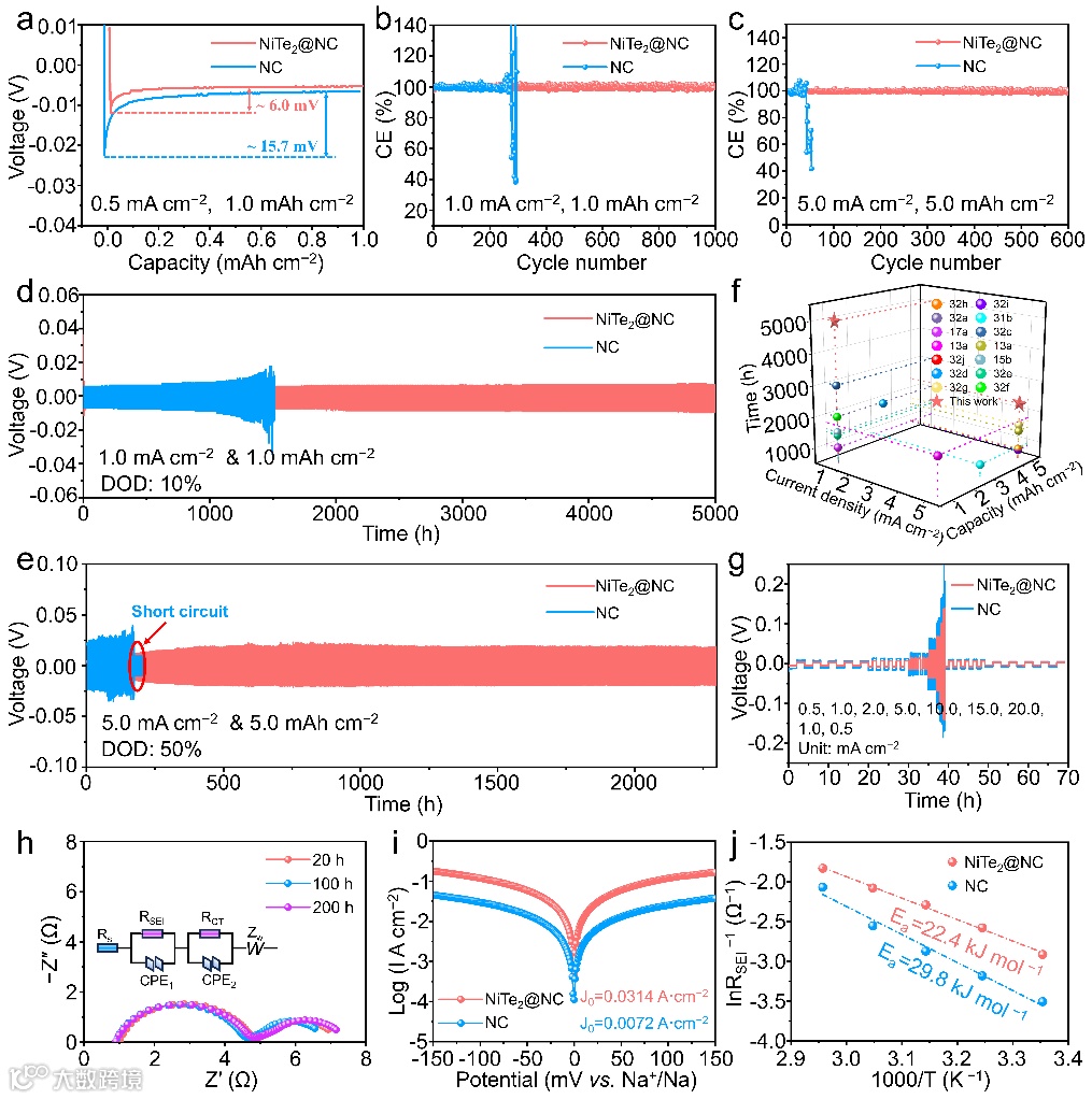 图 2. NiTe2@NC和NC电极在0.5 mA cm−2下的成核过电位。b)1.0 mA cm−2和1.0 mAh cm−2和c)5.0 mA cm−2和5.0 mAh cm−2时的库仑效率。NiTe2@NC@Na和NC@Na对称电池在d)1.0 mA cm−2和1.0 mAh cm−2以及e)5.0 mA cm−2和5.0 mAh cm−2中的恒电流沉积/剥离电压曲线。在用于Na金属电池的各种宿主之间的对称电池中的电化学性能的比较。g)在各种电流密度下NiTe2@NC@Na和NC@Na电极的对称电池的倍率性能。h)在20、100和200小时后NiTe2@NC@Na对称电池的奈奎斯特图。i)NiTe2@NC的塔菲尔曲线。j)Na离子扩散的活化能。