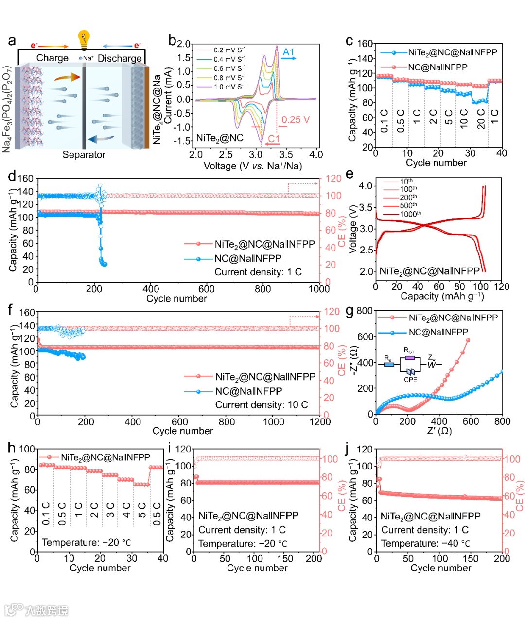 图 3. a)NiTe2@NC@NaNFPP全电池的示意性配置。b)NiTe2@NC@Na||NFPP全电池在2.0 V和4.0 V之间的不同扫率下的CV曲线。c)全电池的倍率性能。d)全电池在1.0 C的电流速率下的循环性能。e)全电池的恒电流充电/放电曲线。f)全电池在10.0 C下的循环性能。g)NiTe2@NC@Na||NFPP和NC@Na||NFPP全电池在循环之前的EIS曲线。h) -20℃下全电池的倍率性能。低温下1C电流密度时全电池的循环性能i)-20℃,j)-40℃。