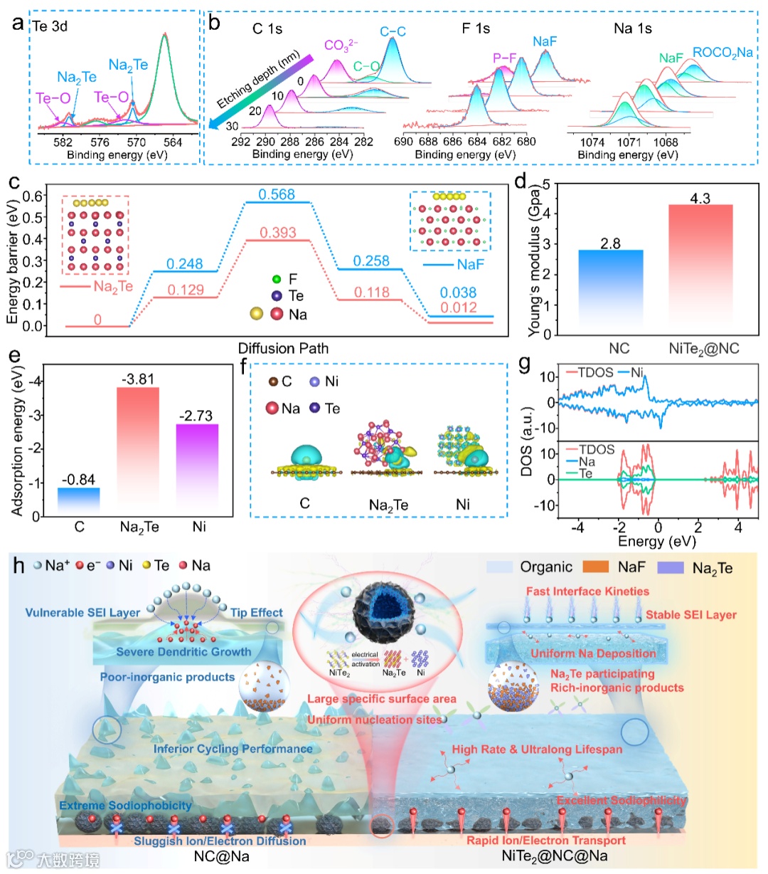 图5. a)在蚀刻30 nm的深度下,NiTe2@NC电极的Te 3d的高分辨率XPS光谱。b)在不同蚀刻深度下,NiTe2@NC@Na电极的C 1 s、F 1 s和Na 1 s的高分辨率XPS光谱。c)Na2Te和NaF的能垒的比较(插图:Na+在Na2Te和NaF中扩散路径的侧视图)d)NiTe2@NC和NC电极的杨氏模量测量e)Na+在C、Na2Te和Ni表面上的吸收能。f)吸附在C、Na2Te和Ni团簇上的Na原子的几何优化的原子构型。g)NiTe2@NC和NC的态密度。h)NiTe2@NC电极增强稳定性并促进均匀Na沉积的机制的示意图。