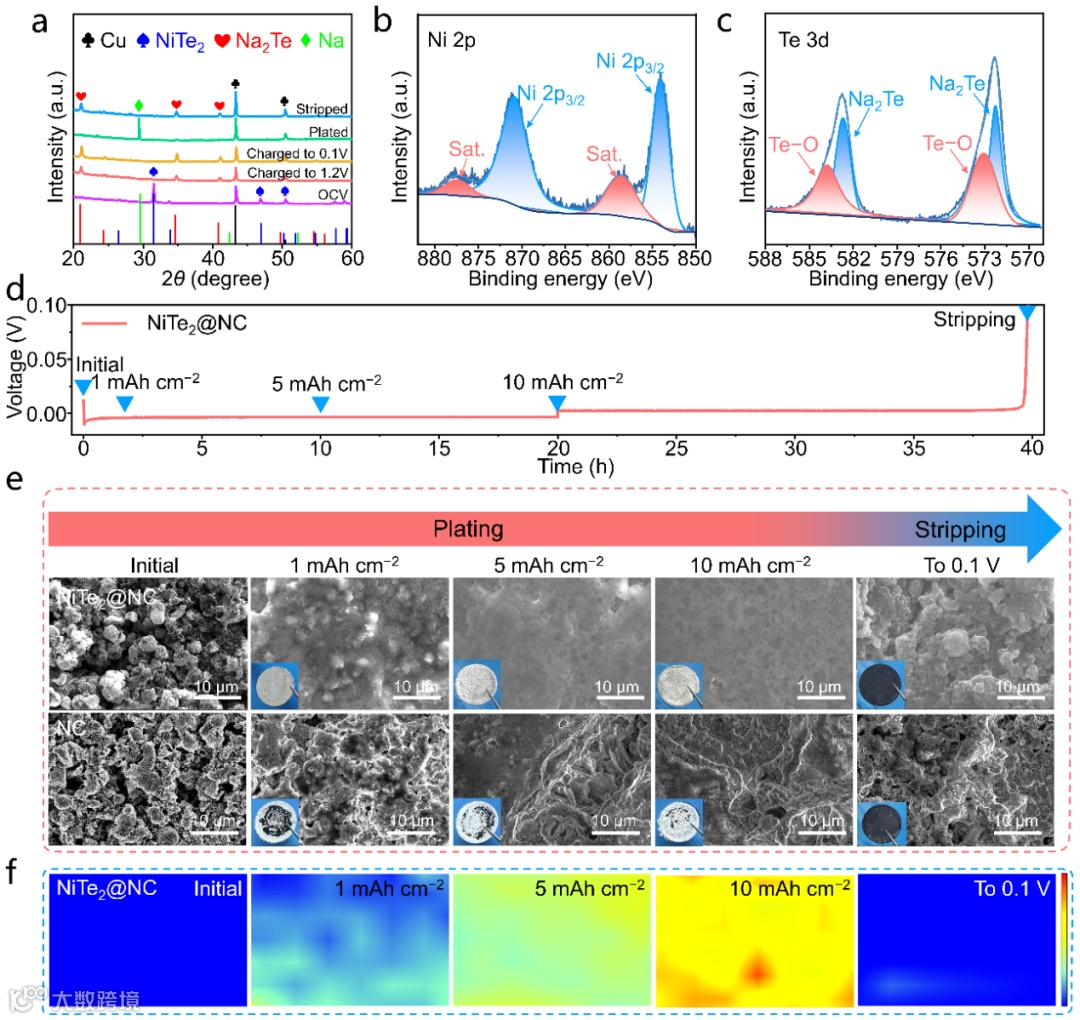 图4. a)在初始沉积/剥离期间NiTe2@NC电极的非原位XRD图案。放电至0.1V后NiTe2@NC的高分辨率XPS光谱:b)Ni 2p,c)Te 3d。d)NiTe2@NC电极在0.5 mA cm−2下的电压-时间曲线,沉积/剥离面积容量为10.0 mAh cm−2。e)不同沉积容量的NiTe2@NC和NC电极上钠沉积的SEM形貌演变。f)NiTe2@NC电极上沉积/剥离过程中的拉曼Mapping光谱。